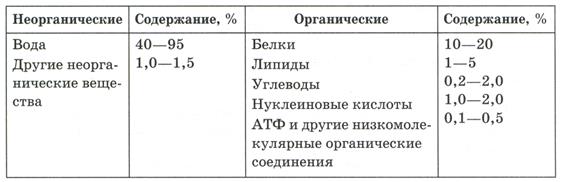 Макро- и микроэлементы присутствуют в живой материи в виде разнообразных химических соединений, которые подразделяются на неорганические и органические вещества. К неорганическим веществам относятся: вода и минеральные вещества. К органическим веществам относятся: белки, жиры, углеводы, нуклеиновые кислоты, АТФ и другие низкомолекулярные органические вещества. Процентное соотношение указано в таблице 1.