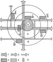 Рисунок 1.2 — Приклад підрахунку величини архітектурно-планувального потенціалу (АЛЛ) ділянок забудови в залежності від їх розміщення у плані міста. Архітектурно-планувальні осі: 1 — головні; 2 — загальноміські; З —районні; 4 — ділянки (райони) забудови; 5 — зона центру міста; А, Б, В — зони міста відповідно — центральна, серединна, периферійна; б — містобудівна якість (чисельник — номер ділянки, знаменник — коефіцієнт значущості) Якісна характеристика архітектурно-планувальних структурних елементів може здійснюватись на засадах використання методу визначення питомого архітектурно-планувального потенціалу (додаток 3.1).