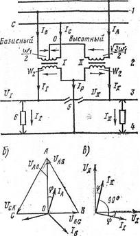 Рисунок 3.5. Первый вариант схемы питания (а) и векторная диаграмма (б)тяговой сети однофазного тока с помощью двух однофазных трансформаторов 2, соединенных в открытый треугольник (остальные обозначения те же, что на рисунке 1.11)