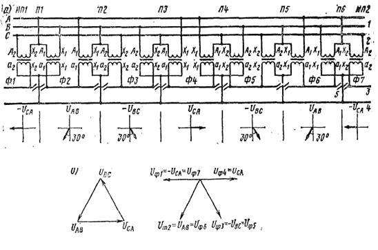Рисунок 3.21. Схема питания участка однофазного тока через трехфазные трансформаторы, соединенные по схеме Y/∆ – 11, при двустороннем питании линии передачи: а – схема питания; б – векторная диаграмма напряжений первичной и вторичной обмоток: 1 – трехфазная линия передачи: 2 – трехфазный трансформатор; 3 – контактная есть; 4 – рельсы; 5 – нейтральная вставка