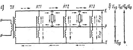 Все эти соображения следует еще дополнить тем, что нагрузка тяговых подстанций непрерывно изменяется в большом диапазоне и практически никогда нагрузки отдельных подстанций не бывают равны друг другу. Таким образом, описанные выше различные схемы питания электрифицированных участков, хотя и позволяют более равномерно загрузить линии передачи, но не решают всей проблемы несимметрии. На практике вопросы несимметрии тока и напряжения решают только исходя из конкретных условий. Вопросы несимметрии будут рассмотрены более подробно в гл. 4. Трехпроводная система тяговой сети переменного тока с автотрансформаторами. Рассматриваемая система является разновидностью системы электрической тяги переменного тока промышленной частоты, поскольку локомотив при ней остается тем же. Изменения относятся только к системе электроснабжения (рисунок 3.22). При этой системе на тяговых подстанциях с помощью специальных трансформаторов или дополнительных автотрансформаторов создается трехпроводная система питания с двумя различными или одинаковыми значениями напряжений. Соответственно имеются две системы шин, на которые и подаются эти напряжения. Одно из них, равное номинальному напряжению электровозов, подается на систему контактная подвеска – рельс, а второе – на систему рельсы – продольный фидер, подвешиваемый на опорах контактной сети. Вектор этого напряжения повернут относительно вектора первого на 180° (рисунок 3.22, б). Таким образом, общее напряжение между контактной подвеской и продольным фидером равно разности этих напряжений, т.е. значительно больше напряжения; на локомотиве. При этой системе между тяговыми подстанциями ТП на небольшом расстоянии друг от друга (8-15 км) располагают автотрансформаторы AT1, AT2. Первичная обмотка получает питание от тяговой подстанции по контактной подвеске К и продольному фидеру П при напряжении, значительно превосходящем напряжение на локомотивах.