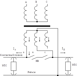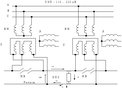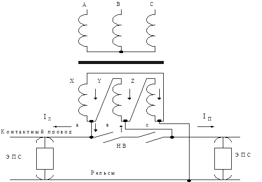 Рис. 3.23. Принципиальная схема системы тягового электроснабжения переменного тока 25 кВ. На рисунке А, В, С – фазы питающей ЛЭП; ВН – обмотка высокого напряжения; Р – обмотка для питания нетяговых (районных) потребителей; Т – тяговая обмотка трансформатора; НВ – нейтральная вставка контактной сети; К – контактная сеть; ЭПС – электроподвижной состав; Iкс – ток в контактной сети; Iэ – ток электровоза; Ip –ток в рельсах; Iз – ток, стекающий в землю с рельсов; I рф- ток рельсового фидера (отсоса), возвращающийся на тяговую подстанцию, образуя замкнутый контур