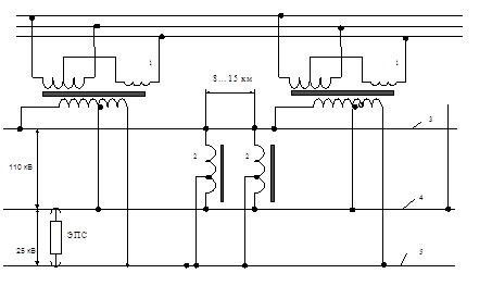 Рис. 3.24а. Упрощенная схема системы тягового электроснабжения 2х25 кВ 1. Понижающие однофазные трансформаторы; 2. автотрансформаторы, размещенные в межподстанционной зоне; 3. питающий провод; 4. контактный провод; 5. Рельсы
