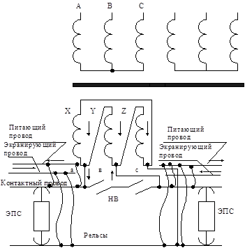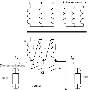 Рис. 3.29. Схема электроснабжения электрической железной дороги на однофазных трансформаторах