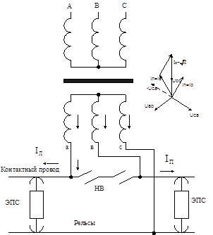Рис. 3.27. К анализу питания тяговых нагрузок трансформатором с тяговой обмоткой, соединенной в звезду