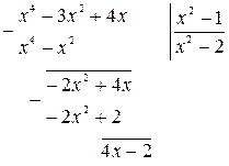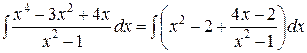 Знайти інтеграли від раціональних дробів: а) Розв’язок. а) Оскільки підінтегральна функція є неправильним раціональним дробом, то виділимо з нього цілу частину, тобто представимо його у вигляді суми многочлена і правильного раціонального дробу. Розділимо многочлен у чисельнику на многочлен у знаменнику куточком.