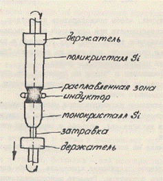 Метод бестигельной зонной плавки кремния основан на плавлении небольшой зоны поликремниевой цилиндрической заготовки, находящейся в вертикальном положении (рисунок 3.11).