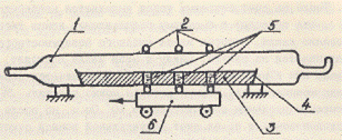 Рисунок 3.12 – Зонная очистка Ge. Приведенные методы зонной плавки для Si и Ge являются наиболее эффективными. Вертикальная бестигельная зонная плавка для Ge невозможна, так как коэффициент поверхностного натяжения жидкого Ge в отличие от Si очень мал. Узкая расплавленная зона Si удерживается между твердыми частями слитка за счет больших сил поверхностного натяжения (рисунок 3.11). Процесс горизонтальной зонной плавки ПП слитка по схеме рисунка 3.12 для Si не используется. Графитовая лодочка может стать источником реакции расплава Si с углеродом, что не позволит получить слитки Si высокой степени чистоты.