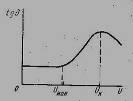Рисунок 4.13 – График зависимости тангенса угла диэлектрических потерь конденсаторной бумаги от температуры. Зависимость tg d от f объясняется так. При малых f число поворотов диполей за единицу времени невелико, значит, невелика и рассеиваемая мощность. Частота увеличивается, увеличивается число поворотов, значит, увеличивается и рассеиваемая мощность и tg d. При достаточно высокой f tg d начинает уменьшаться, так как диполи не успевают следовать за изменением электрического поля. С увеличением температуры максимум зависимости tg d от f смещается в область высоких частот, так как с увеличением температуры вязкость и время релаксации уменьшается. Потери, вызванные ударной ионизацией свойственны пористым и слоистым диэлектрикам с газовыми включениями и газам. В газах при повышении U > UПР, называемом порогом ионизации, в газовых включениях в диэлектрике возникает процесс ударной ионизации, т.е. расщепление атомов или молекул газа на ионы и электроны. Увеличивается рассеяние энергии электрического поля и tg d увеличивается достигая максимума. При напряжении UК газ уже полностью ионизирован, процесс ионизации заканчивается, энергия больше не расходуется на ионизацию, и tg d уменьшается. Ионизация газовых включений особенно опасна для неорганического диэлектрика с закрытыми порами, так как может вызвать местный перегрев изделия и его разрушение. Для этого такие диэлектрики пропитывают маслами, лаками, компаундами (например конденсаторная бумага) (рисунок 4.14).