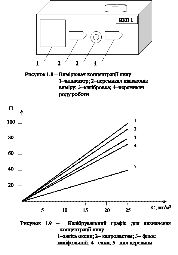 Оцінити концентрацію за калібрувальним графіком (рис.1.9), порівняти з ГДК (табл.1.3). якщо попередньо зменшувався діапазон виміру приладу, отриману концентрацію необхідно також зменшити в стільки разів, скільки вказано на приладі (в 10, 100, 1000 разів).При необхідності провести додаткову очистку повітря з використанням фільтруючих матеріалів (за вказівкою викладача). Визначити концентрацію пилу після очистки і також порівняти з ГДК. Оцінити ефективність очистки за формулою 1.17.