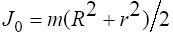 Підставляючи чисельні значення, знаходимо J = 0,0067 кг×м2. Відповідь: J = 0,0067 кг×м2. Задача 5. Знайти момент інерції J плоского кільця масою m = 1 кг щодо осі, перпендикулярної площини кільця і проходячій через точку, що лежить на зовнішньому краї кільця. Внутрішній радіус кільця рівний r = 10 см, зовнішній – R = 20 см. Рішення Згідно теоремі Штейнера, момент інерції кільця J відносно осі, перпендикулярної його площини і проходячій через точку на краю кільця, може бути обчислений таким чином: J = J 0 + ma 2, де J 0 - момент інерції відносно осі, що проходить через центр мас (центр кільця), - відстань між віссю і центром мас. В нашому випадку a = R. Для знаходження моменту інерції J 0 візьмемо до уваги, що момент інерції будь-якого тіла рівний сумі моментів інерції його частин. Відповідно, момент інерції J 1 суцільного диска радіусом R відносно його осі рівний сумі моменту інерції J 2 суцільного диска радіусу r відносно цієї осі, і моменту інерції кільця J 0 . Моменти інерції дисків рівні, відповідно: J 1 = M 1 R 2/2 і J 2 = M 2 r 2/2, де M 1 і M 2 - маси дисків. Тоді можна записати: