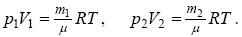 де ni - число атомів і -го хімічного елемента, Ari - відносна атомна маса хімічного елемента з таблиці Менделєєва. Для сірчаної кислоти маємо: Mr = 2 + 32 + 64 = 98. Остаточно одержуємо m = 98×10-3 кг/моль. Відповідь: m = 98×10-3 кг/моль. Задача 2. Визначити кількість речовини n число N молекул азоту масою m = 0,2 кг. Рішення Мольна маса азоту m = kMr = k (2 Ar) = 28 10-3 кг/моль. Кількість речовини азоту n= m /m=0,2/(28×10-3)=7,14 моль. В одному молі речовини міститься число молекул, рівне числу Авогадро. Тому, для шуканого числа молекул азоту одержуємо N = n NA = 4,3 1024 молекул. Відповідь: n = 7,14 моль; N = 4,3 1024 молекул. Задача 3. В балонах місткістю V 1 = 20 л і V 2 = 44 л міститься газ. Тиск в першому балоні р 1=2,4 МПа, в другому р 2 = 1,6 МПа. Визначити загальний тиск р і парціальні тискі p ′1 і p ′2 після з'єднання балонів, якщо температура газу залишилася колишньою. Рішення Рівняння стану газів до їх змішування можна записати у вигляді: