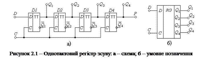 Регістр має один інформаційний вхід D, на який надходить інформація у вигляді послідовності імпульсів, і керуючий вхід С, на який подаються синхронізуючі імпульси. На паралельних виходах регістра Q 1… Q 4 інформація з’являється одночасно, а на послідовному виході Р – тільки по одному біту. Перший тригер D1 відповідає за молодший розряд кожного слова інформації, а D4 – за старший, якщо вважати, що інформація надходить, починаючи зі старшого розряду. З надходженням черги синхронізуючих імпульсів одночасно на динамічні входи С усіх D -тригерів, для яких активним сигналом є фронт, вихід кожного тригера набуватиме стану попереднього по черзі слідкування синхроімпульсів.