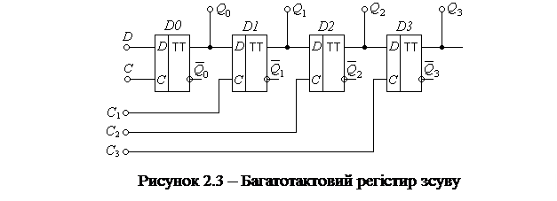 Регістри зсуву багатотактової дії використовують у приладах, для яких швидкодія не обмежена, а визначним фактором є знижка апаратно-енергетичних витрат. Схема багатотактового регістра зсуву на тригерах D -типу наведена на рис. 2.3. Для керування таким регістром потрібні окремий синхроімпульс на вході С для запису інформації та серія синхроімпульсів С 1 – С 3, кількість яких дорівнює числу розрядів регістра. Перший тригер D0 носить назву додаткового. Він відіграє роль проміжного запам‘ятовувача одного біта інформації, що надходить до послідовного входу D. Запис відбувається з приходом першого синхроімпульсу на вхід синхронізації С 1 першого тригера D1. Регістр (рис. 2.3) – трирозрядний, бо має три основних тригери: D1, D2, і D3. Зсув відбувається в наступному такті за допомогою послідовно сформованих синхроімпульсів, що такт за тактом з’являються на синхровходах С 1, С 2, С 3. Перший розряд зсувається за три такти до тригера D3. Загальне число синхроімпульсів для зсуву першого розряду дорівнює 4 (1 запис + 3 зсуви). Другий розряд першим синхроімпульсом записується у додатковий тригер D0, а за допомогою 2-х синхроімпульсів (С 0 та С 1) пересувається до тригера D1. Пересув другого розряду виконується за дією трьох синхроімпульсів, а третього – чотирьох сінхроімпульсів. Аналіз кількості імпульсів дозволяє зробити висновок, що для запису повного n -розрядного слова або зсуву n -розрядів в регістрах даного типу потрібно мати імпульсів зсуву: