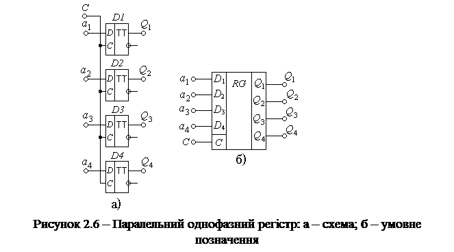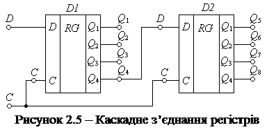 Щодо розрядності регістрів зсуву, то їїможна збільшити їхнім каскадним з’єднанням (рис. 2.5). Для здійснення каскадного з’єднання двох регістрів D1 і D2 необхідно вихід старшого розряду Q4 попереднього регістра D1 поєднати з інформаційним входом D наступного регістра D2 та охопити синхровходи С загальною шиною. Тоді після розряду Q4 наступним буде розряд Q5, потім Q6 і т.д. Паралельні регістри. Паралельні регістри або регістри пам’яті – це багаторозрядні регістри типу PIРO паралельної дії з паралельними входами та паралельними виходами, в яких кількість розрядів визначається числом тригерів, на яких будується регістр. Регістри пам’яті – це накопичувальні регістри. Їхнє основне призначення – збирання двійкової інформації невеликого обсягу. Перший молодший розряд числа записується та зберігається у першому молодшому розряді регістра, другий – у другому розряді і старший розряд регістра приймає старшій розряд числа. Однофазні паралельні регістри однотактової дії можна побудувати, наприклад, на D -тригерах, кількість яких залежить від числа входів регістра.