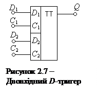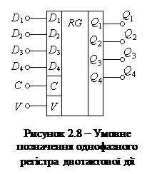До інформаційного входу D 1 надходять послідовно двійкові розряди числа А, а до інформаційного входу D 2 – числа В. Запис п -го розряду двійкового числа А відбувається за наявності фронту синхроімпульсу С 1, а числа В – за наявностіфронту синхроімпульсу С 2. Попереднього обнуління регістра даного типу, тобто скидання всіх тригерів у стан нуля перед записом нової інформації, виконувати не треба. Класифікація регістрів пам’яті здійснюється за трьома ознаками: – однофазні паралельні регістри однотактової дії; – однофазні паралельні регістри двотактової дії; – парафазні паралельні регістри. Однофазні паралельні регістри однотактової дії досить економічні та надійні. Швидкодія цих регістрів більша приблизно в два рази за однофазні регіс-три двотактової дії, але при цьому ж порівнянні апаратні втрати на реалізацію однотактних регістрів більше. Серед регістрів двотактової дії найбільш економічними за числом компонентів вважаються регістри, які побудовані на синхронних тригерах СSR –типів або двотактових D –тригерах. Регістри даного типу мають обов’язково вхід R (або V) установлення тригерів у стан 0. Тому для запису числа треба сформувати два синхросигнали: перший подається на вхід R (або V) для скидання всіх тригерів, а другий – на вхід С для запису інформації, що присутня на інформаційних входах D. Умовне позначення такого регістра наведено на рис. 2.8.