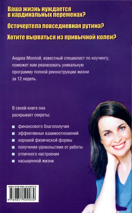 АНДРЕАМОЛЛОЙ Г. Минск, тел. (8-10-375-17) 237-29-76, e-mail: popuri@mail.ru; www.popuri.ru; г. Москва, Издательский дом «Белкнига», тел. (495)675-21-88, 600-58-41; e-mail: popuri-m@mail.ru; г. Новосибирск, «Топ-Книга», тел. (383) 336-10-28; книга - почтой: 630117, а/я 560; Интернет-магазин: www.top-kniga.ru: e-mail: office@top-kniga.ru Научно-популярное издание МОЛЛОЙ Андреа ЛАЙФ-КОУЧИНГ. МЕНЯЮ ЖИЗНЬ! Перевод с английского — Е. А. Бакушева Оформление обложки — М. В. Драко Подписано в печать с готовых диапозитивов 03.11.09. Формат 84х 108/32. Бумага газетная. Печать высокая с ФПФ. Усл. печ. л. 14,28. Уч.-изд. л. 10,43. Тираж 3500 экз. Заказ 2203. Санитарно-эпидемиологическое заключение № 77.99.60.953.Д.010108.09.08 от 22.09.2008 г. ООО «Попурри». Лицензия № 02330/0548529 от 03.02.09. Республика Беларусь, 220113, г. Минск, ул. Мележа, 5, корп. 2, к. 403. При участии ООО «Харвест». Лицензия N° 02330/0494377 от 16.03.09. Республика Беларусь, 220013, г. Минск, ул. Кульман, д. 1, корп. 3, эт. 4, к. 42. ОАО «Полиграфкомбинат им. Я. Коласа». ЛП №02330/0150496 от 11.03.2009. Республика Беларусь, 220600, г. Минск, ул. Красная, 23.