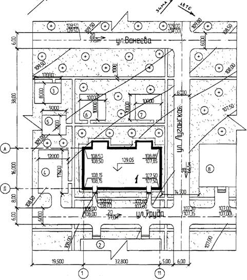 ЧЕРТЕЖ ГЕНПЛАНА (включающий в себя план благоустройства, план озеленения и разбивочный чертеж). Чертеж генплана содержит: 1. строительную геодезическую сетку в виде «+» в углах квадратов со стороной 10 см. Начало координат принимают в нижнем левом углу листа. Оси строительной геодезической сетки обозначают арабскими цифрами, соответствующими числу сотен метров от начала координат и прописными буквами русского алфавита. ПРИМЕР: для Ml:1000 0А (начало координат); 1А; 2А; ЗА - вертикальные оси ОБ (начало координат); 1Б;.2Б; ЗБ - горизонтальные осп ПРИМЕР: для М1:500 0А (начало координат); 0А+50; IA; 1А + 50 - вертикальные оси ОБ (начало координат); 0Б+50;.1Б; 1Б+50 - горизонтальные оси 2. «красную» линию, отделяющую территорию магистрали, улицы, проезды и площади от территории, предназначенной под застройку; 3 ограждение с воротами и калитками (для детских садов, школ, больниц и т.д.); 4. проектные горизонтали через 0,5 м с указанием уклона проектного рельефа (назначается студентами самостоятельно от 1% до 5%). Горизонтали не проводятся по зданиям, дорогам, площадкам с покрытием; 5. здания и сооружения с указанием: