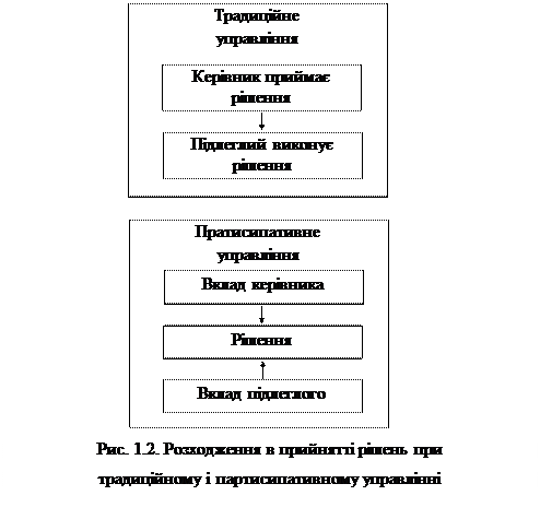 Відповідь Американський менеджмент ввібрав в себе всі школи і підходи до управління, розглянуті вище. У 60-і рр. ХХ в. теоретики менеджменту Дж.Коул, А.Горц та ін. запропонували доктрину “виробничої демократії”. Її суть полягає в залученні в управління непрофесіоналів. Розходження в прийнятті рішень при традиційному і партисипативному управлінні показані на рис.1.2. Ідеї партисипативного управлінні можуть бути співвіднесені з ідеями теорій мотивації, які обпираються на аналіз потреб людини.