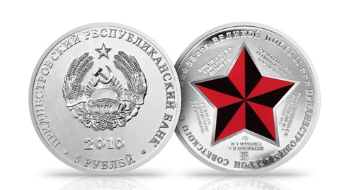 На лицевой стороне: в центре – изображение государственного герба Приднестровской Молдавской Республики. По кругу надписи: вверху – «ПРИДНЕСТРОВСКИЙ РЕСПУБЛИКАНСКИЙ БАНК», внизу – «5 РУБЛЕЙ». В нижней части под гербом год выпуска монеты – «2010».