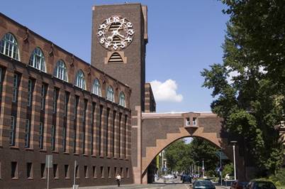 Рисунок 3 ─ Входной зал выставки в Турине, 1902 г. Выставочный павильон в Ольденбурге (1905) отмечен симметрией кубического объема, композиция крематория в Хагене (1906), созданного под влиянием инкрустированной мрамором архитектуры флорентийского ренессанса, предельно ясна, декор геометричен. В проектах жилых домов влияние классицизма. http://murzim.ru/jenciklopedii/100-velikih-arhitektorov/16711-peter-berens.html В 1907 году Беренс был приглашен на должность генерального художественного консультанта в крупнейший электропромышленный концерн Германии АЭГ. В берлинской конторе Беренса сотрудничали Гропиус, Мис ван дер Роэ, Ле Корбюзье. Это объединение стремилось сделать высокое эстетическое качество продукции средством борьбы за международные рынки, а создание представительного, монументального облика производственных сооружений считало необходимым условием утверждения престижа фирмы. В обязанности Беренса входило проектирование не только предметов электрического оборудования, фирменных упаковок, каталогов и плакатов, но и зданий фабрик и мастерских. Специфика промышленной продукции массового производства впервые получила полноценное художественное выражение в работах Беренса для АЭГ. http://murzim.ru/jenciklopedii/100-velikih-arhitektorov/16711-peter-berens.html По его проектам был построен ряд промышленных корпусов и административных зданий, в которых он стремился передать дух крупного промышленного предприятия. Среди них цех сборки турбин в Берлине — гигантский железобетонный каркас с навесными стенами — стеклянными экранами. Примечательно, что этот результат был достигнут без декоративных стилизаций, из стали и стекла, первом в Германии. Рунге