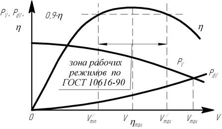 Основные свойства вентилятора, как устройства предназначенного для перемещения воздуха, принято оценивать по его аэродинамическим параметрам: давлению, производительности и потребляемой мощности при нормальных атмосферных условиях, а также коэффициенту полезного действия (КПД). Аэродинамические характеристики вентилятора обычно включают в себя: - кривую полного давления Pv (V); - кривую мощности N (V) или полного КПД вентилятора η (V); - кривую (либо шкалу) динамического давления вентилятора Pdv (V). Существуют три основных вида аэродинамических характеристик лопаточных вентиляторов (рис. 5): - ниспадающая кривая полного давления (рис. 5, а); - кривая полного давления с обратным склоном (рис. 5, б); - кривая полного давления с разрывом характеристики (рис. 5, в). В соответствии с ГОСТ10616-90 рабочая зона аэродинамической характеристики вентилятора должна быть ограничена диапазоном производительностей, в котором полный КПД вентилятора составляет 0,9 от максимального КПД (рис. 5, а). Именно в таком виде приведены аэродинамические характеристики вентиляторов в каталогах большинства производителей вентиляторов. Однако, в этом случае теряются режимы максимальной производительности, при которых возможна работа вентилятора, хотя и с меньшей эффективностью. При подборе вентиляторов (радиальных, осевых) по аэродинамическим характеристикам, приведенным в каталогах, необходимо обращать внимание на следующее: а) является ли указанная в характеристиках мощность, потребляемой вентилятором, или же это мощность, потребляемая электродвигателем вентилятора из сети; б) имеет ли электродвигатель, комплектующий вентилятор, запас мощности на пусковые токи, низкие температуры перемещаемой среды. Эти параметры определяют эффективность вентилятора, его аэродинамические характеристики и работоспособность электродвигателя при низких температурах перемещаемого воздуха.