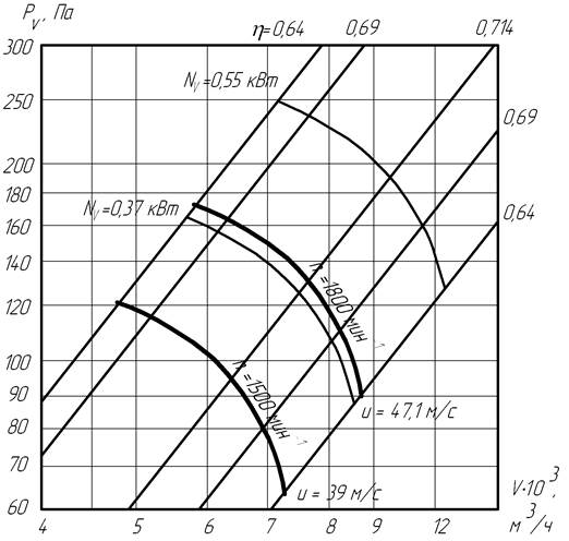 Изолинии установочных мощностей соответствуют величине установочной мощности определенного двигателя и определяет границу, выше которой любая точка совместной работы вентилятора и сети не может быть обеспечена этим двигателем и требует установки двигателя большей мощности. Изолинии КПД представляют собой линии равных значений КПД для любых режимов работы вентилятора.
