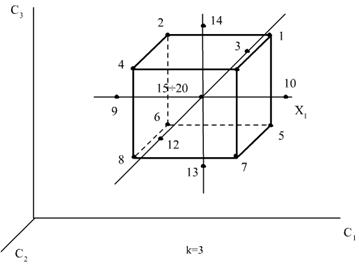 где m – число уровней каждого фактора; k – число факторов. Первый этап планирования эксперимента для получения линейной модели основан на варьировании факторов на двух уровнях, следовательно: