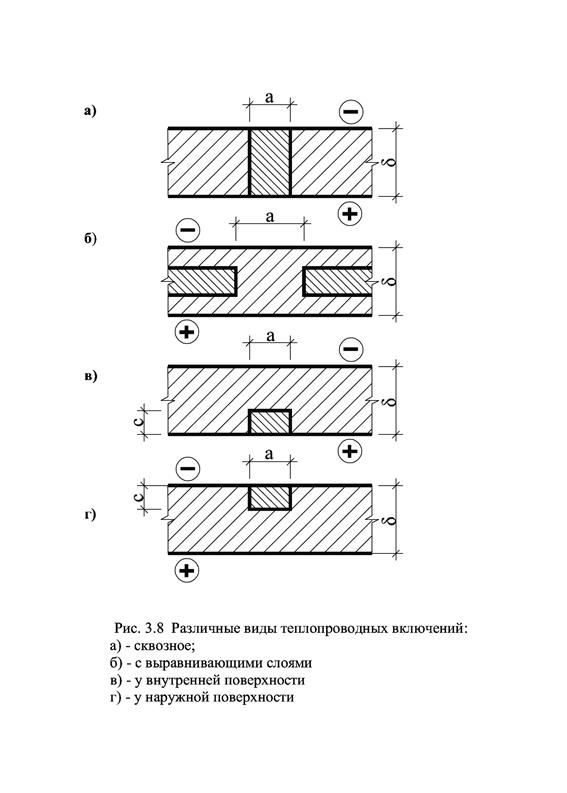 Отдельные участки ограждения содержат соединительные элементы между слоями (ребра, стержневые связи), сквозные и несквозные теплопроводные включения. На таких участках в поперечном сечении ограждающей конструкции присутствуют более теплопроводные материалы, что уменьшает сопротивление теплопередаче в зоне подобных неоднородностей. Определение сопротивления теплопередаче таких конструкций по формуле (3.6), применимой в случае теплотехнически однородных ограждений, дает завышенные результаты, иногда существенно отличающиеся от действительных значений. Теплотехнический расчет неоднородных ограждающих конструкций состоит в определении приведенного сопротивления теплопередаче Rr0. В Своде правил по проектированию тепловой защиты зданий приведен ряд методик по определению Rr0. Ниже будет рассказано о некоторых из них. I. Определение приведенного сопротивления теплопередаче на основе расчета температурных полей. Приведенное сопротивление теплопередаче Rr0, м2·ºС/Вт, неоднородной ограждающей конструкции или ее фрагмента определяют по формуле Rr0 = (tint - text) · F/ Q, (3.12) где F – площадь неоднородной ограждающей конструкции или ее фрагмента, м2; Q – суммарный тепловой поток через конструкцию или ее фрагмент площадью F, Вт; tint – расчетная температура внутреннего воздуха, ºС, принимая согласно гл.1; text - расчетная температура наружного воздуха, ºС, о которой речь пойдет в п.3.7. Q определяется на основе расчета температурных полей (возможен также экспериментальный способ). Расчет температурного поля проводится с использованием численных методов. Исследуемая область разбивается на элементарные блоки с выделением участков с различными коэффициентами теплопроводности, таким образом формируется расчетная сетка. В узлах этой сетки по формулам выбранного численного метода определяются значения температур. В результате расчета температурного поля получают осредненный тепловой поток, проходящий через рассчитываемый участок площадью F. Процедура расчета осуществляется на ЭВМ с использованием вычислительной программы. II. Определение приведенного сопротивления теплопередаче с использованием коэффициента теплотехнической неоднородности Допускается приведенное сопротивление теплопередаче Rr0 характерного i-го участка неоднородной ограждающей конструкции вычислять по формуле Rr0 = R0 · r, (3.13) где R0 - сопротивление теплопередаче i-го участка однородной ограждающей конструкции, определяемое по формуле (3.6); r – коэффициент теплотехнической однородности i-го участка ограждающей конструкции, учитывающий влияние стыков, откосов проемов, обрамляющих ребер, гибких связей и других теплопроводных включений. На рис. 3.8 приведены различные виды теплопроводных включений. Для плоских неоднородных ограждающих конструкций, содержащих такие включения, коэффициент теплотехнической однородности r допускается определять по формуле