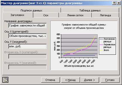 В поле ввода «Подписи оси Х» ввести диапазон, где располагаются подписи для значений по оси Х. Для этого необходимо: - нажать кнопку с красной стрелкой, которая располагается в правой части строки ввода; - выделить диапазон (значения графы «Объем производства»); - нажать Enter. ® нажать «Далее»®… В появившемся окне ввести: название диаграммы, подписи под осями X и Y, как это показано на рисунке:
