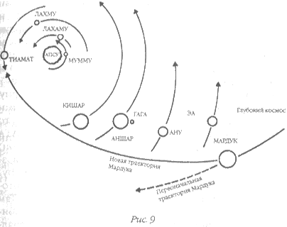 В эту еще нестабильную и молодую Солнечную систему (по моим оценкам примерно четыре миллиарда лет назад) вторгся чужак. Шумеры называли его Нибиру, а вавилоняне переименовали в Мардука — в честь своего бога. Он появился из открытого космоса — из «глубины», если пользоваться терминологией древних. По мере приближения к внешним планетам Солнечной системы пришелец стал испытывать на себе их влияние. Первой планетой, чье гравитационное поле стало притягивать Нибиру, был Нептун, или по-шумерски ЭЛ. «Эа, родитель, там его создал», — гласит древний текст. Сам Нибиру/Мардук представлял собой захватывающее зрелище — для его описания использовались такие прилагательные, как обольстительный, сияющий, величественный, царственный. Искры и вспышки света низвергались с него на Нептун и Уран, когда он проходил мимо них. Возможно, он уже имел собственные спутники или приобрел их, притянув от внешних планет. «Немыслимо облик его совершенен — трудно понять, невозможно представить... Четыре глаза, четыре уха!» — так говорит о нем древний текст. Когда Нибиру/Мардук проходил мимо Эа/Нептуна, один его бок начал раздуваться, как будто у него росла вторая голова. Может быть, именно это вздутие оторвалось и стало спутником Нептуна Тритоном? В пользу этой гипотезы говорит тот факт, что проникнувший в Солнечную систему Нибиру/Мардук вращался по ретроградной орбите (по часовой стрелке), что не совпадало с направлением вращения остальных планет (рис. 9). Одно лишь это утверждение шумеров, в соответствии с которым вторгнувшаяся в Солнечную систему планета двигалась навстречу всем остальным, способно объяснить ретроградную орбиту Тритона, вытянутые эллиптические орбиты других спутников и комет, а также другие важные явления, которые мы будем рассматривать ниже.