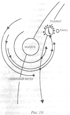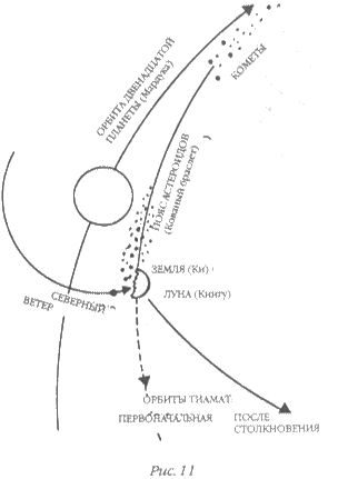 Выпустил молнию перед собою, Сверкающим пламенем наполнил тело. Он сделал сеть: уловить изнутри Тиамат... Ужасом, словно плащом, он покрылся. Он главу окружил сиянием грозным. Когда две планеты вместе со своими спутниками сошлись достаточно близко, чтобы Нибиру/Мардук мог «заглянуть в Тиамат» и «Кингу, супруга ее, разведать планы», а затем опутать ее «сетью» (магнитным полем?) и обстрелять мощными электрическими зарядами («божественными молниями»), Тиамат «взревела» и «взвилась вверх», а ее тело раздулось. В коре планеты открылись разломы, из которых, вероятно, вырывались пар и вулканическая лава. В расширяющуюся расщелину Нибиру/Мардук швырнул один из своих главных спутников, «злой Вихрь». Он «нутро ей взрезал, завладел ее сердцем». Первое столкновение не только раскололо Тиамат и «лишило ее жизни», но и определило судьбу ее спутников — за исключением похожего на планету Кингу. Попав в «сеть» — гравитационное и магнитное поле — Нибиру/Мардука, «рассеялось войско ее, разбежались отряды». Спутники не только сошли со своих прежних орбит, но и стали двигаться в обратном направлении: От страха дрожа, назад повернули, Убежали, жизни свои спасая. Именно так образовались кометы — текст 6000-летней давности объясняет их вытянутые эллиптические орбиты и вращение в обратном направлении. Что касается главного спутника Тиамат Кингу, то в результате первого этапа этой небесной битвы Кингу лишился своей почти независимой от Тиамат орбиты. Нибиру/Мардук «вырвал таблицы судеб, что достались тому не по праву» и превратил Кингу в ДУТ.ГА.Е, «массу безжизненной глины», лишенную атмосферы, воды и радиоактивных элементов и уменьшенную в размерах, он «сковал его» и оставил на орбите вокруг разбитой Тиамат. Победив Тиамат, Нибиру/Мардук обрел новую «судьбу». Шумерский текст не оставляет сомнений в том, что чужак стал вращаться вокруг Солнца: Пересек небосвод, обозрел пространство. Подобье Апсу, чертог Нудиммуда, он измыслил. Размеры Апсу измерил Владыка. Обогнув Солнце (Апсу) Нибиру/Мардук вновь устремился в дальний космос. Но теперь, перейдя на солнечную орбиту, он должен был вернуться. По возвращении его приветствовал Эа/Нептун, а Аншар/Сатурн провозгласил его победу. Затем новая орбита снова привела его к месту небесной битвы — «к Тиамат, что он одолел, он снова вернулся». Усмирился Владыка, оглядел ее тело. Рассек ее тушу, хитроумное создал. Разрубил пополам ее, словно ракушку. Этим действием закончилось формирование «небес», и наступила фаза создания Земли и Луны. Сначала новое столкновение разбило Тиамат на две половины. Верхняя часть, или «череп», столкнулась со спутником Нибиру/ Мардука, который носил название «Северный Ветер». Удар отбросил ее в сторону, и вместе с Кингу она полетела «по местам потаенным» — то есть по новой орбите, на которой раньше не было планеты. Так образовались Земля и Луна (рис. 11).
