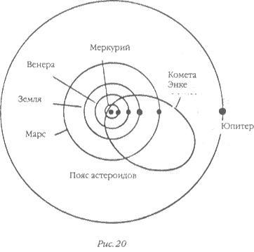 В 1986 году человечество стало свидетелем редчайшего события — появления посланника из прошлого, вестника творения. Это комета Галлея. Являясь одной из многих комет (и массы мелких объектов), бороздящих космическое пространство, комета Галлея во многих отношениях уникальна. Помимо всего прочего, ее первое появление письменно зафиксировано несколько тысяч лет назад, а в 1986 году современная наука имела возможность впервые провести всеобъемлющие исследования кометы и ее ядра. Первый факт подчеркивает совершенство древней астрономии, а данные, полученные в результате современных исследований, — в очередной раз — согласуются с тем, что написано в древних «мифах творения». Цепочка научных открытий, позволившая Эдмунду Галлею, который в 1720 году получил титул Королевского астронома, прийти к выводу, что комета, которую он наблюдал в 1682 году, является периодической и именно ее наблюдали в1531и1б07 году, включала в себя закон всемирного тяготения и законы небесной механики сэра Исаака Ньютона. Ньютон консультировался с Галлеем по поводу своих открытий. До этого считалось, что кометы пересекают небо по прямой линии, появляясь в одном конце небесного свода и исчезая в другом, чтобы никогда не вернуться. Однако Галлей, основываясь на законах Ньютона, сделал вывод, что кометы движутся по эллиптическим орбитам, которые возвращают эти небесные тела туда, где их наблюдали раньше. «Три» кометы, наблюдавшиеся в 1531, 1607 и 1682 года были необычны тем, что вращались в «неправильном» направлении — по часовой стрелке, а не против. Они имели сходный угол наклона относительно орбит вращающихся вокруг Солнца планет — примерно 17—18 градусов — и были похожи внешне. Сделав вывод, что это одна и та же комета, Галлей вычислил период ее обращения (промежуток времени между появлениями) — примерно семьдесят шесть лет. Затем он предсказал, что в следующий раз комета появится в 1753 году. Он не дожил до этого времени и не увидел, как сбывается его предсказание, но появившаяся на небосводе комета была названа в его честь. Орбита кометы, как и орбиты всех небесных тел, — легко изменяется под действием гравитации планет (особенно это справедливо в отношении Юпитера). Каждый раз, когда комета приближается к Солнцу, составляющие ее замерзшие частицы пробуждаются к жизни: у нее появляется голова и длинный хвост, и она начинает терять часть своей массы, превращаясь в газ и пар. Все эти процессы влияют на орбиту кометы. Поэтому более точные измерения установили, что период обращения кометы Галлея составляет от семидесяти четырех до семидесяти девяти лет, а вычисленные ее первооткрывателем семьдесят шесть лет являются средней цифрой. Действительную орбиту и период обращения следует заново вычислять при каждом новом появлении этого небесного тела. Современные приборы позволяют ежегодно наблюдать пять-шесть комет, одна или две из которых уже появлялись на нашем небе, а остальные являются новыми. Большинство повторно зарегистрированных комет имеют короткий период обращения. Самый короткий из всех периодов обращения зарегистрирован у кометы Энке, которая приближается к Солнцу, а затем возвращается в район пояса астероидов (рис. 20) чуть больше чем за три года. У большинства комет период обращения составляет около семи лет, и это значит, что орбита уводит их в окрестности Юпи