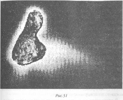 Интенсивные наблюдения начались в ноябре 1985 года, когда у кометы Галлея сформировались оболочка и ядро. Ученые из Национальной обсерватории Китт-Пик сообщали о том, что «основным компонентом кометы является лед, а большая часть окружающего ее разреженного облака представляет собой водяной пар». Сьюзен Уайкоф из Государственного университета Аризоны утверждала, что это «первое веское доказательство преобладания льда». Наблюдения при помощи телескопов в январе 1986 года были дополнены исследованиями в инфракрасной области спектра, выполненными с высотного самолета, в результате чего группа ученых, в состав которой входили сотрудники NASA и астрономы из нескольких американских университетов, обнаружила «прямое подтверждение, что вода является основным компонентом кометы Галлея». К январю 1986 года у кометы Галлея образовался огромный хвост и ореол из газообразного водорода, достигавший 12,5 миллиона миль в поперечнике — это в пятнадцать раз больше диаметра Солнца. Именно в этот момент инженеры NASA подали команду космическому аппарату «Пионер-Венера» (он находился на орбите вокруг Венеры) нацелить свои приборы на приближающуюся комету (перигелий орбиты кометы Галлея располагался между Венерой и Меркурием). Спектрометр аппарата, который «видит» атомы изучаемого объекта, определил, что «комета ежесекундно теряет 12 тонн воды». Когда в марте 1986 года комета приблизилась к своему перигею, Йен Стюарт, директор проекта NASA в исследовательском центре Эймса, сообщил, что скорость потери воды «многократно увеличилась» — сначала до 30, а затем до 70 тонн в секунду. Тем не менее, он заверил представителей прессы, что даже при такой потере у кометы Галлея «достаточно льда, чтобы совершить еще тысячи витков». Исследования кометы Галлея с близкого расстояния начались 6 марта 1986 года, когда космический аппарат «Вега-1» вошел в сияющий ореол кометы и прислал на Землю первые фотографии ее ядра, сделанные с расстояния 6000 миль. Пресса с почтением отмечала, что человечество видит вещество небесного тела, образовавшегося одновременно с Солнечной системой. 9 марта «Вега-2» пролетела на расстоянии 5200 миль от ядра кометы и подтвердила данные, полученные «Вегой-1». Космический зонд также обнаружил, что кометная «пыль» содержит комки твердого вещества, некоторые из которых достигают размеров булыжника, и что эта твердая оболочка покрывает ядро с температурой — на расстоянии почти 90 миллионов миль от солнца — 85 градусов по Фаренгейту. Два японских космических аппарата, предназначенные для исследования воздействия солнечного ветра на хвост кометы и огромное водородное облако, должны были пройти на значительном расстоянии от кометы Галлея. Европейский зонд «Джотто», наоборот, направлялся буквально «в лоб» комете и должен был на большой скорости пройти в 300 милях от ее ядра. 14 марта (по европейскому времени) «Джотто» промчался мимо сердца кометы Галлея и обнаружил там «загадочные ядра» черного как смоль цвета с размерами, которые трудно было предположить (примерно половина острова Манхэттен). У них была шероховатая поверхность и неправильная форма — некоторые напоминали «две горошины в стручке», а другие были похожи на «неправильной формы картофелину» (рис. 31). Из этих ядер вырывались пять потоков, состоявших из пыли и на 80 процентов из водяного пара, 