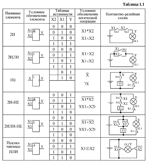 Для двух аргументов логического элемента возможны 16 логических функций. В данном пособии рассматриваются логические функции: логическое И, логическое ИЛИ, логическое НЕ, логическое И-НЕ, логическое ИЛИ-НЕ, сумма по модулю 2. В таблице 1.1 приведены условные обозначения элементов 2И, 2ИЛИ, НЕ, 2И-НЕ, 2ИЛИ-НЕ, исключающее ИЛИ (сумма по модулю 2), условные обозначения выполняемых этими элементами логических операций, таблицы их истинности и контактно-релейные схемы. При анализе контактно-релейной схемы элемента исключающее ИЛИ необходимо учитывать, что положения переключателей SA1 и SA2 в таблице 1.1 соответствуют логическим единицам (верхнее положение подвижного контакта переключателя соответствует логической единице), т.е. Х1=1 и Х2=1. Лампочка HL1 горит лишь в том случае, когда подвижный контакт одного из переключателей находится в верхнем положении, а подвижный контакт второго переключателя в нижнем положении. Из анализа работы данной контактно-релейной схемы получаем таблицу истинности элемента исключающее ИЛИ.