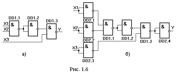 Рассмотрим решение следующей задачи: имея в распоряжении логические элементы 2И-НЕ, сконструировать устройство, реализующее операцию 3ИЛИ-НЕ для режима положительной логики. Эту задачу решим в два этапа. Сначала сконструируем устройство, выполняющее операцию 3И-НЕ для режима положительной логики (рис. 1.6,а), а потом на входах и выходе элемента 3И-НЕ установим логические элементы НЕ (рис. 1.6,б).