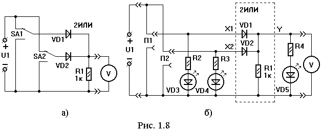 Вспомним особенности вольтамперной характеристики полупроводникового кремниевого диода небольшой мощности. При обратном напряжении ток, протекающий через диод, составляет десятые доли микроампера. Напряжение на диоде при протекании через него в прямом направлении тока в десятки миллиампер, равно приблизительно 0,7-0,8 В. Определим примерно параметры логических уровней на выходах данного элемента, если на входе действуют логические уровни с указанными ранее параметрами. Если на оба входа поданы напряжения логических «1», то токи через диоды VD1 и VD2 не протекают, и напряжение на выходе элемента при условии, что сопротивление нагрузки значительно больше сопротивления резистора R1, будет примерно равно напряжению питания. Если хотя бы один из входов элемента соединить с минусовым проводом источника питания, то на выходе элемента в случае кремниевых диодов будет напряжение 0,7 - 0,8 В (зависит от сопротивления резистора R1 и напряжения источника питания). Примечание: для рассмотренного логического элемента логическая «1» на входе будет, если вход никуда не подключен или подключен к плюсовому выводу источника питания. На рисунке 1.7,б приведена схема простого и удобного в работе стенда для исследования диодно-резистивного логического элемента 2И. Светодиоды VD3 - VD5 являются индикаторами логических сигналов на входах и выходе логического элемента. Вольтметр V позволяет определить напряжения логической единицы и логического нуля. Для диодно-резистивного логического элемента 2И напряжение логического нуля на выходе примерно 0,7-0,8 В, а напряжение логической единицы чуть меньше напряжения на зажимах источника питания (определяется соотношением сопротивлений резистора R1 и нагрузки). На рисунках 1.8,а и 1.8,б приведены схемы для исследования диодно-резистивного логического элемента 2ИЛИ. Для этого элемента напряжение логического нуля на выходе равно 0 В, а напряжение логической единицы равно напряжению питания минус 0,7-0,8 В.