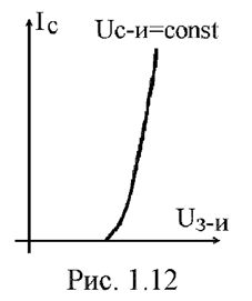 При напряжении затвор-исток, равном нулю, в цепи сток-исток ток не протекает при любых допустимых напряжениях сток-исток, так как образуются два p-n перехода, причем верхний подключен в обратном направлении. Подадим на затвор относительно истока положительный потенциал. В полупроводниках p-типа имеются неосновные носители заряда (электроны). Рассмотрим движение электронов и дырок в слое полупроводника p-типа, прилежащем к затвору. Для упрощения рассмотрения соединим область p-типа с выводом истока. Под действием электрического поля, обусловленного наличием напряжения затвор – исток, дырки будут двигаться вправо, а электроны влево, т.е. в полупроводнике в приграничной к затвору области концентрация дырок уменьшается, а концентрация электронов увеличивается. При определенном напряжении затвор-исток в указанной области концентрация электронов станет больше концентрации дырок, наступит инверсия проводимости, т.е. в приграничной к затвору области появится слой полупроводника n-типа. В этом случае в цепи сток-исток протекает ток, т.к. между выводами стока и истока появился канал n-типа. Этот канал называется индуцированным (наведенным). Для понимания принципа работы логических элементов на полевых транзисторах необходимо знать, что собой представляет стоко-затворная характеристика полевого транзистора. Стоко-затворная характеристика полевого транзистора в схеме включения с общим истоком (исток является общим для входной и выходной цепи) - это зависимость тока стока от напряжения затвор-исток при постоянном напряжении сток-исток. Эта характеристика полевого транзистора с изолированным затвором с индуцированным каналом n-типа приведена на рисунке 1.12. Особенности стоко-затворных характеристик полевых транзисторов с изолированным затвором с индуцированным каналом позволяют использовать эти транзисторы в качестве электронных ключей. Сравним основные характеристики электронного ключа на полевом транзисторе с характеристиками механического ключа. Сопротивление разомкнутого механического ключа можно считать бесконечно большим (пока не наступит электрический пробой), сопротивление ключа на полевом транзисторе порядка 10 МОм. Когда контакты механического ключа замкнуты сопротивление между контактами составляет сотые доли ома, для такого же состояния полевого транзистора сопротивление между стоком и истоком сотни Ом.