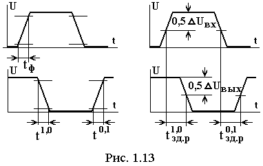 На рисунке 1.13 показано, как определяется длительность фронта входного импульса tф, время перехода интегральной микросхемы из состояния логической единицы в состояние логическогонуля t1,0, время перехода интегральной микросхемы из состояния логического нуля в состояние логической единицы t0,1, время задержки распространения при включении t1,0зд, р, время задержки распространения при выключении t0,1зд, р.