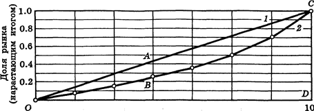 В использованном выше примере рынка А (табл. 2) кривая Лоренца будет иметь вид, как показано на рис. 1. Индекс Джини можно выразить следующим образом: