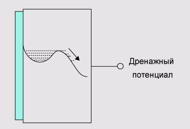 Рис. 3.8. Вертикальный электронный дренаж Вертикальный дренаж осуществляется подачей потенциала на подложку ЭОП, причем его значение подбирается так, чтобы при достижении уровня переполнения «лишние» электроны стекали через подложку из потенциальной ямы. Побочным эффектом является уменьшение емкости потенциальной ямы и, как следствие, уменьшение динамического диапазона светочувствительного элемента. Кроме того, данная система неприменима в матрицах с обратной засветкой.