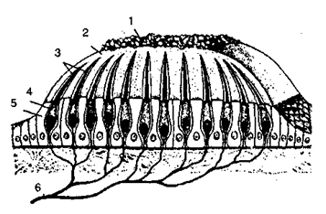 Рис. 4.9. Строение отолитового аппарата: 1 — отолиты; 2 — отолитовая мембрана; 3 — волоски рецепторных клеток; 4 — рецепторные клетки; 5 — опорные клетки; б — нервные волокна