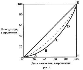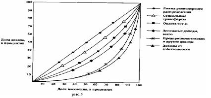Теперь, вспомнив категории личного и располагаемого дохода, можно обратиться к конкретным проблемам неравенства в распределении доходов: какова пропасть между богатыми и бедными? И можно ли вообще измерить неравенство в распределении доходов? Одним из наиболее известных способов измерения этого неравенства является построение кривой Лоренца. Речь идет при этом о персональном, а не функциональном распределении доходов. Если мы разделим все население страны на 5 частей (квинтилей), т. е. по 20%, и совокупные доходы общества также по 20%, то можем увидеть, что линия, исходящая из начала осей координат (биссектриса) дает нам представление о равном распределении доходов (рис.1). Кривая Лоренца основана на расчете кумулятивных долей (накопленных долей), и соответственно, построении кумулятивной кривой. На оси абсцисс мы откладываем первые 20% населения; затем, добавив вторую группу, получаем 40% населения, затем 60% и т. д. На оси ординат мы откладываем кумулятивные значения доходов: первые 20%, затем 40%, далее 60% и т. д. Если бы 20% населения получали бы 20% совокупных личных доходов, 40% населения - 40% доходов, и т. д., то мы построили бы как раз биссектрису, называемую линией абсолютного равенства. Но в реальности распределение не бывает абсолютно равным. Например, первые 20% населения получают 5% доходов, 40% населения - 15% доходов, 60% населения - 35% доходов, 80% населения - 60% доходов, и, наконец, 100% населения - 100%» всех доходов общества. В соответствии с этими значениями мы и строим кривую Лоренца, которая отклоняется от линии абсолютного равенства. Кривая Лоренца (на нашем графике кривая OABCDE) будет более вогнутой по отношению к биссектрисе, если распределение доходов отличается большей неравномерностью. На рис.1 мы можем увидеть и линию абсолютного неравенства, идущую под прямым углом (OFE).Сплошная линия кривой Лоренца показывает распределение личных доходов (до вычета налогов и без трансфертов). Но после уплаты налогов и получения трансфертов мы можем построить новую кривую Лоренца (пунктирная линия), т. е. кривую для располагаемого дохода. Она менее вогнутая, так как в результате перераспределительных процессов уменьшилось первоначальное неравенство в уровне доходов. Очевидно, чем больше отклоняется кривая Лоренца от биссектрисы, тем сильнее неравенство в распределении доходов, и чем активнее социальная политика государства по выравниванию доходов, тем менее вогнута данная кривая. В зависимости от конкретных социальных программ и систем налогообложения в той или иной стране будет зависеть отличие кривых Лоренца, построенной для личных и для располагаемых доходов. На рис. 2 приведены различные кривые Лоренца для России на 1997 г., отражающие распределение доходов от собственности, предпринимательских доходов, доходов от труда (заработная плата) и т. д.