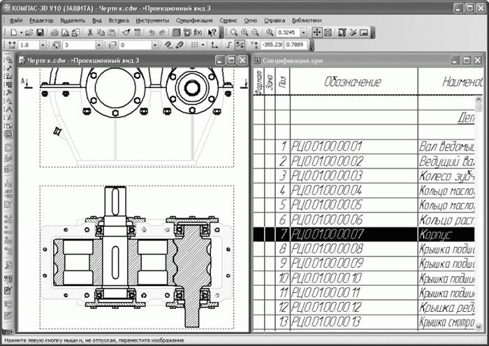 Если вы сейчас откроете окно спецификации данного чертежа в подчиненном режиме, то увидите, что без каких-либо дополнительных действий с вашей стороны из трехмерной модели были подгружены все объекты спецификации, включая объекты спецификации для стандартных изделий. Следующий наш шаг, полагаю, вполне очевиден. Создайте пустой документ КОМПАС-Спецификация и подключите к нему ассоциативный чертеж редуктора (для этого откройте окно Управление сборкой и выберите сохраненный файл чертежа). Строки спецификации сразу же заполнятся, при этом нумерация позиций будет соответствовать нумерации, которая была задана еще в подчиненной спецификации модели редуктора. Запустите режим просмотра состава объектов (кнопка Показать состав объекта панели Спецификация) и пощелкайте на строках объектов. Как видите, в окне представления чертежа подсвечивается изображение тех или иных деталей редуктора, причем на всех трех проекционных видах сразу (конечно, если деталь видна на всех трех видах). И все это, заметьте, без каких бы то ни было усилий с вашей стороны – основную работу система КОМПАС проделала самостоятельно. Наша работа еще не закончена. На чертеже явно не хватает линий-выносок с обозначением позиций. Более того, простого проставления обозначений недостаточно. Желательно, чтобы при выделении объекта спецификации в режиме просмотра состава объектов в окне графического документа вместе с геометрией подсвечивалась и линия-выноска. Это значит, что в состав геометрии уже сформированных ассоциативных объектов спецификации необходимо добавить еще по одному графическому элементу – линии-выноске. К счастью, редактор спецификаций системы КОМПАС-3D располагает и такими возможностями. Добавление геометрических объектов чертежа в состав объекта спецификации продемонстрируем на примере. Все остальные линии-выноски подключаются к соответствующим объектам спецификации аналогично. 1. На компактной панели инструментов активируйте панель Обозначения. Нажмите кнопку Обозначение позиций и создайте линию-выноску с позицией номер 1, указывающую на ведомый вал на виде-разрезе. 2. Выделите построенную линию-выноску и, не снимая выделения, переключитесь в окно документа-спецификации. В спецификации выделите строку (объект), к геометрии которого вы собираетесь добавить обозначение позиции. 3. Нажмите кнопку Редактировать состав объекта
