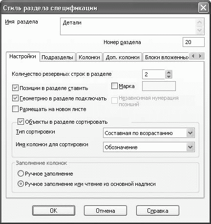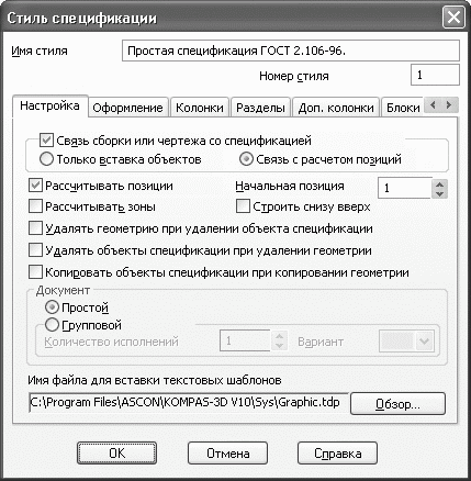 В последних версиях системы КОМПАС-3D появилась очень удобная возможность копирования объектов спецификации при копировании графических элементов чертежа. Чтобы включить эту функцию, необходимо в окне настроек нужного вам стиля спецификации установить соответствующий флажок. Для открытия этого диалога выполните команду меню Сервис > Библиотеки стилей > Стили спецификаций. В появившемся окне выберите требуемый стиль, например Простая спецификация ГОСТ 2.106—96, после чего нажмите кнопку Редактировать стиль. На экране появится еще одно окно – Стиль спецификации (рис. 4.22). На первой вкладке данного окна и находится упомянутый выше флажок – Копировать объекты спецификации при копировании геометрии.