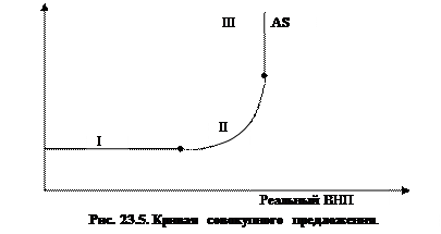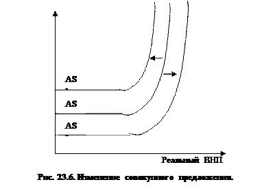 Графическая форма кривой совокупного предложения представителями разных экономических школ трактуется по-разному, о чем свидетельствует рис. 23.5. Как видим кривая совокупного предложения разделена на три отрезка: I – горизонтальный (Кейнсианский), II – промежуточный, III – вертикальный (классический). I отрезок называется «кейсианским», т.к. Кейнс утверждал, что кривая совокупного предложения горизонтальная. На этом промежутке реальный объем производства (предложения) не достиг еще своего потенциального уровня, имеются резервы мощностей, запасы сырья, уровень занятости – неполный. Горизонтальный отрезок свидетельствует, что экономика находится в состоянии депрессии и что не используется большое количество машин, оборудования и рабочей силы. На этом отрезке рост производства будет происходить за счет неиспользуемых ресурсов и не будет сопровождаться ростом цен. Промежуточный отрезок кривой совокупного предложения является восходящим. На этом отрезке одновременно наблюдается рост производства и рост цен. Это обусловливается либо неравномерным развитием отдельных отраслей производства, либо тем, что для увеличения объема выпуска было использовано старое оборудование или менее квалифицированные работники. В результате издержки на единицу продукции растут, повышая цены на конечные товары. Следовательно, на этом отрезке рост спроса вызывает и рост производства, и некоторый рост цен. Вертикальный (классический) отрезок. Классическая школа утверждает, что кривая совокупного предложения является вертикальной. Классики исходят из того, что экономика работает на полную мощность и при полной занятости ресурсов. В таких условиях за короткий срок невозможно достичь дальнейшего увеличения совокупного спроса. Отдельные фирмы могут пытаться расширить свое производство, предлагая более высокие цены за ресурсы, но тем самым они понижают объемы производства других фирм. Усиление конкуренции на рынке ведет к повышению их цен. Таким образом, изменение совокупного спроса может оказать влияние только на уровень цен, но не затрагивает объемов совокупного производства (предложения). Кривая AS отражает динамику издержек производства на единицу продукции в связи с изменением уровня цен. Как было отмечено, эти издержки не изменяются на горизонтальном отрезке, но растут на промежуточном и вертикальном отрезках. Но есть факторы, которые могут сдвинуть кривую AS в иное положение, что будет свидетельствовать о новом уровне издержек на единицу продукции. Основными неценовыми факторами, влияющими на совокупное предложение являются: - изменение цен на ресурсы (например, на импортные ресурсы). При удорожании ресурсов предложение уменьшится; - изменение производительности труда. При увеличении производительности предложение увеличиться; - изменение налогов. Снижение налогов с предприятий увеличит предложение. Эти факторы могут вызывать лево- и правосторонний сдвиг кривой совокупного предложения (рис. 23.6.)