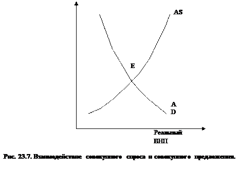 Проанализировав в отдельности совокупный спрос и совокупное предложение, можно обратиться к проблеме макроэкономического равновесия. Графически этот анализ будет означать совмещение на одном рисунке кривых AD и AS (рис. 23.7.). Соотношение совокупного спроса и совокупного предложения определяют уровни реального ВНП и цен, установившихся в данный период. Общее равновесие достигается в точке Е, точке пересечения АD и AS, и означает, что продавцы и покупатели удовлетворены, т.е. уровень цен таков, что покупатели готовы покупать ровно столько, сколько продавцы готовы произвести и продать.