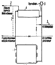Рис. 6.3 Схема включения экономайзера в систему горячего водоснабжения: 1 — теплообменник; 2 — бойлер; 3 — аккумулятор; 4 — стояки горячего водоснабжения; 5 — обратный клапан.