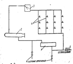 Рис.6.2. Схема экономайзера: 1 — тепловослринимающая поверхность; 2 — задвижка; 3—кран; 4—теплоотдающая поверхность; 5 — расширительный бачок.