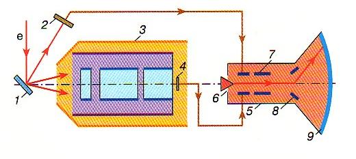 Рис. 3.17. Схематическое изображение растрового оже-спектрометра: 1 – образец, 2 – коллектор для сбора вторичных электронов, 3 – энергоанализатор, 4 – детектор энергоанализатора, 5 – электронно-лучевая трубка, 6 – катод электронной пушки, 7 – модулятор электронной пушки, 8 – отклоняющие пластины электронно-лучевой трубки, служащие для получения растра, 9 – экран электронно-лучевой трубки.